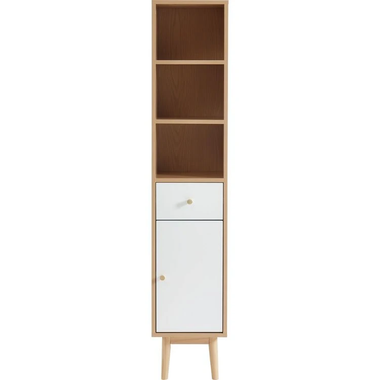 | Descriptif produit | Meuble, de, rangement, pour, salle, de, bain, SUNI, -, Structure, MDF, -, Revêtement, mélaminé, blanc, et, bois, clair, -, 1, porte, 3, niches, 1, tiroir, -, Poignées, en, métal, finition, laiton, -, Pieds, en, bois, massif, de, pin, -, Dimensions, :, L30, x, P29, 5, x, H152cm |
