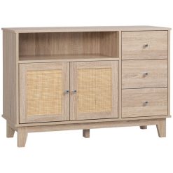 Bon marché ???? HOMCOM Buffet 2 Portes 3 Tiroirs Coulissants Niche Style Bohème Chic Cannage En Rotin Panneaux Aspect Chêne Clair ⭐