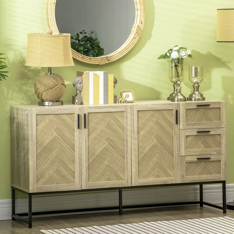 Acheter 🧨 HOMCOM Buffet Meuble De Rangement Motif Chevron 3 Placards Et 3 Tiroirs – Piètement Métal – Structure MDF – I156 Cm 💯