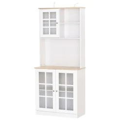 Grosses soldes 😍 HOMCOM HOMCOM Armoire De Cuisine Multi-rangements 3 Portes Vitrine Verre Avec étagère 2 Niches Grand Plateau MDF Blanc Chêne 🔔