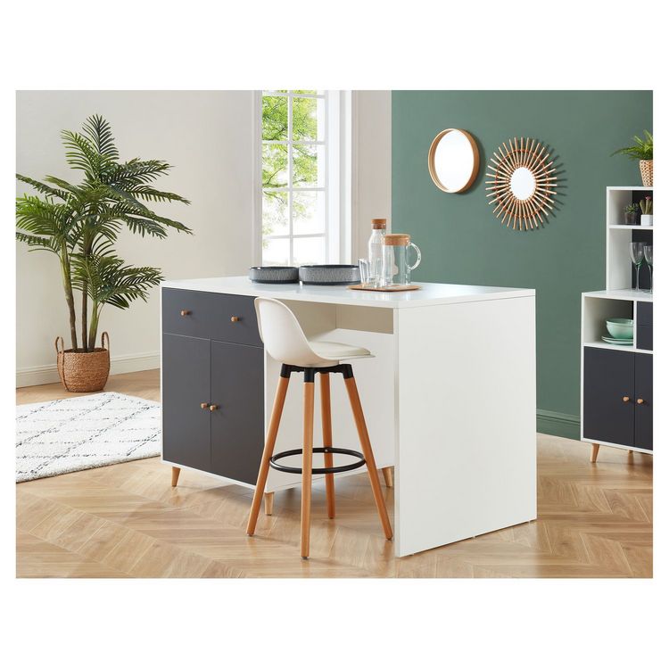 | Dimensions | Un, îlot, central, pratique, grâce, à, ses, nombreux, espaces, de, rangement., Ce, dernier, peut, accueillir, jusqu'à, 2, personnes, à, table. |