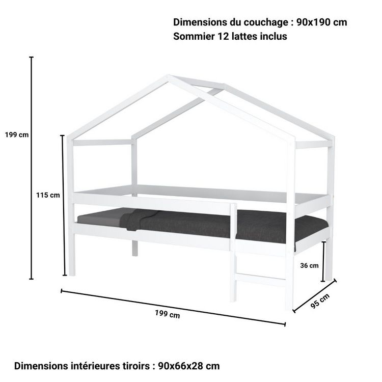 Grosses soldes ???? Lit Cabane Bois Massif 90×190 Cm Avec 2 Tiroirs Sommier Barrière Et échelle ELIO ????