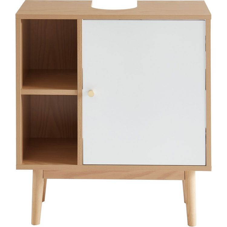 | Descriptif produit | Meuble, sous-vasque, pour, salle, de, bain, SUNI, -, Structure, MDF, -, Revêtement, mélaminé, blanc, et, bois, clair, -, 1, porte, et, 2, niches, -, Poignées, en, métal, finition, laiton, -, Pieds, en, bois, massif, de, pin, -, Dimensions, :, L60, x, P29, 5, x, H67cm |