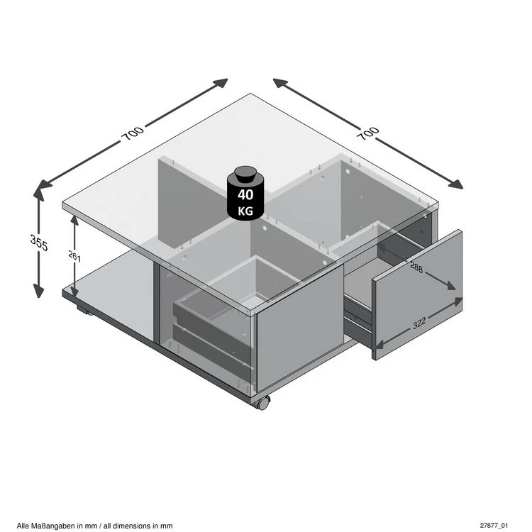 | Descriptif produit | Table, basse, carrée, sur, roulettes, avec, 2, tiroirs |